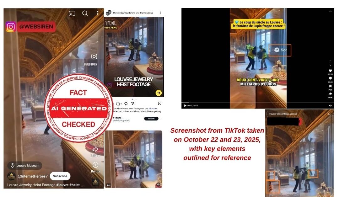 A video recently went viral across Instagram, TikTok, X (formerly Twitter), and YouTube, claiming to show two men stealing jewels from the Apollo Gallery of Paris’s Louvre Museum during the real-life heist that took place on October 19, 2025. In the alleged clip, two figures dressed in yellow vests are seen hurriedly placing valuables into a black bag as alarms blare in the background. The camera pans over shards of glass scattered across the floor, revealing a display case and a crown that appears untouched. The video concludes with the supposed thieves climbing through a window into the night. Within hours, the clip was being reshared by millions of users, often accompanied by captions asserting that it was “exclusive footage” from inside the Louvre. However, a detailed forensic review conducted by CyberPoe’s verification desk confirms that the circulating video is entirely fake and AI-generated, not authentic footage from the actual crime scene.
