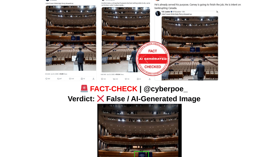 In late January 2026, an image began circulating widely across X,[1] Facebook,[2] Threads,[3] and several regional platforms,[4] purporting to show former Canadian prime minister Justin Trudeau delivering a speech at the World Economic Forum in Davos to an almost empty conference hall. The image was shared alongside mocking captions portraying Trudeau as politically irrelevant after his resignation in January 2025. One widely repeated line sarcastically claimed that “not even Katy Perry showed up,” referencing his reported relationship with the American singer. The visual was presented as definitive proof that Trudeau’s appearance at Davos had failed to attract interest or legitimacy.