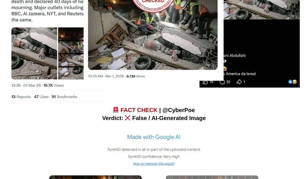An image circulating widely on social media including X,[1] Facebook[2] and other platforms  [3]claims to show Iranian Supreme Leader Ayatollah Ali Khamenei’s body trapped beneath rubble following alleged airstrikes carried out by the United States and Israel. The picture depicts rescue workers searching through debris while what appears to be Khamenei’s body lies partially buried under collapsed structures.