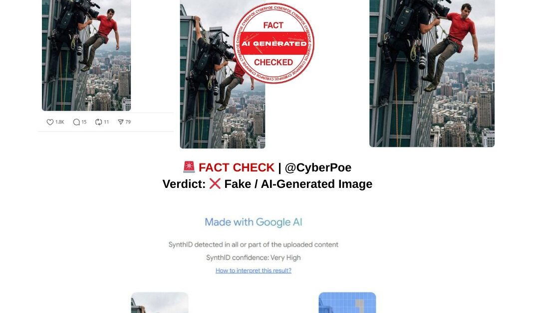 The image claiming to show a cameraman hanging off Taipei 101 to film Alex Honnold’s free-solo climb is not authentic. It is an AI-generated creation, flagged by Google’s SynthID detection system and contradicted by verified footage, photographs, and broadcast details from the event. While Honnold’s climb itself was real and historic, the circulating image is a fictional embellishment designed to amplify drama.