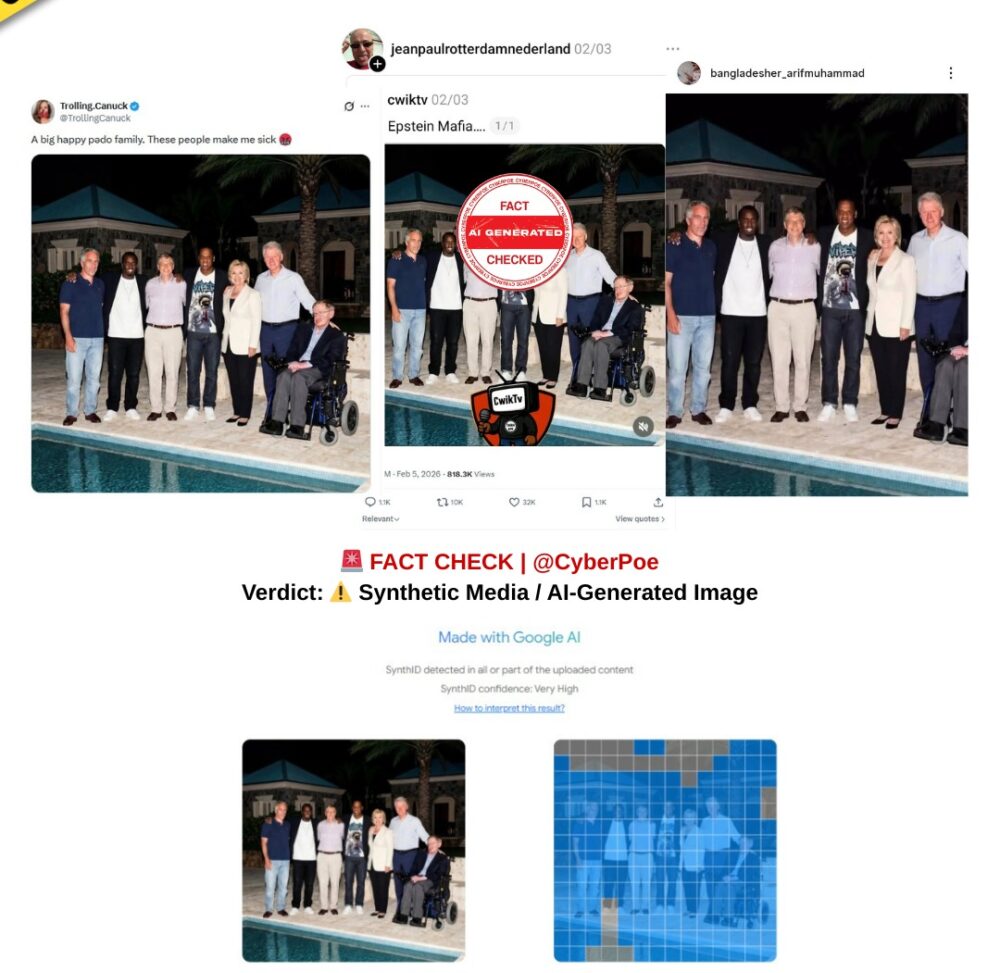 The image claiming to show Jeffrey Epstein alive in Israel is entirely fabricated. It originated from an AI-focused online forum, carries both visible and invisible markers linked to Google’s Gemini tools, and was openly acknowledged as synthetic by its creator. There is no credible evidence that Epstein survived his death in 2019, and the image does not document a real person or event.