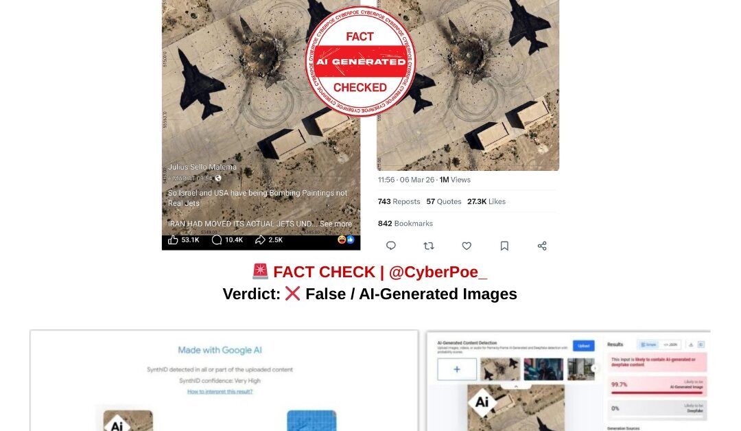 The viral “satellite images” claiming that U.S. and Israeli pilots bombed painted aircraft decoys in Iran are synthetic visuals created using artificial intelligence. Multiple technical indicators including visual inconsistencies and AI detection analysis confirm the images were digitally generated and do not represent real satellite reconnaissance.