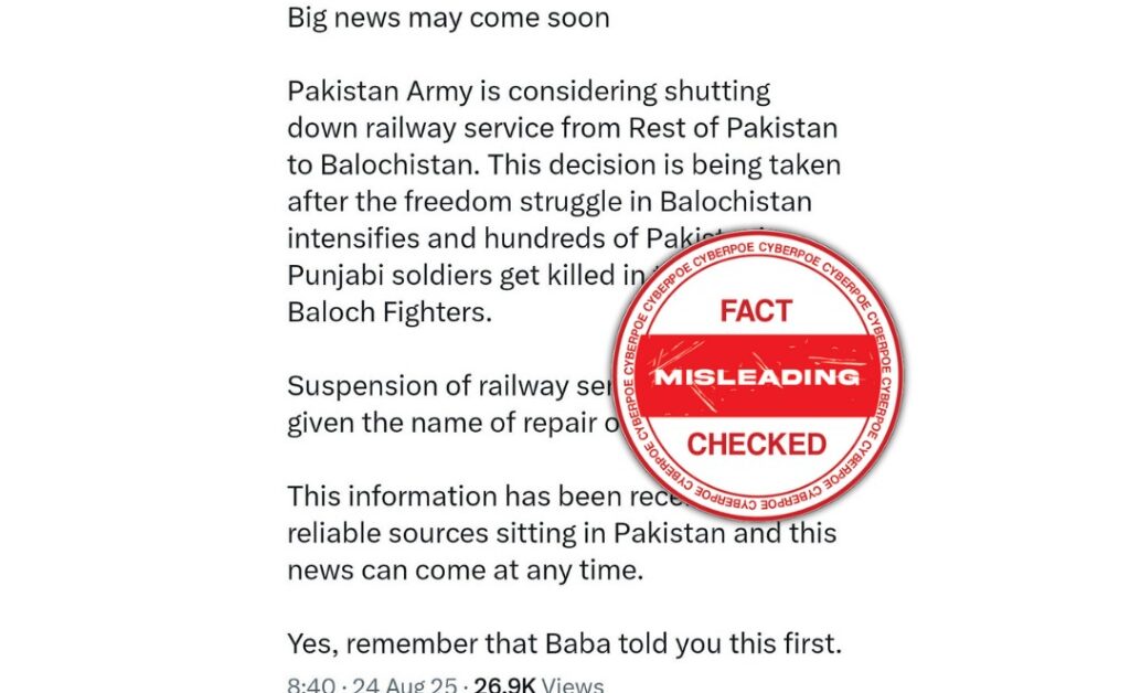 A narrative began circulating on social media, pushed by an India-linked handle, claiming that the Pakistan Army had decided to permanently shut down railway services between the rest of Pakistan and Balochistan. According to the post, this move was being disguised as “track repairs” and was allegedly triggered after “hundreds of Punjabi soldiers” were killed in attacks carried out by Baloch fighters. The claim framed this as a major policy shift and presented it as insider information from “reliable sources in Pakistan.” At first glance, the story was designed to sound urgent, alarming, and credible.