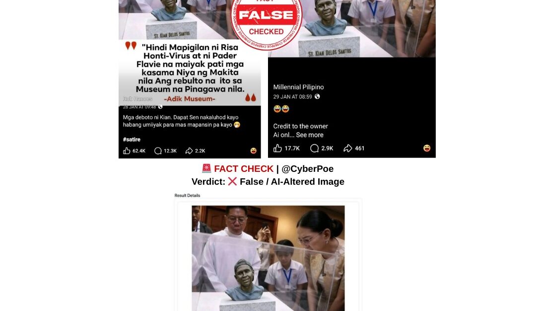 The post gained traction rapidly, fueled by the emotional weight of Kian delos Santos’ case and ongoing debates surrounding accountability for abuses during Duterte’s anti-drug campaign. However, CyberPoe’s verification establishes that the image is not an authentic representation of the exhibition and was digitally manipulated using artificial intelligence.