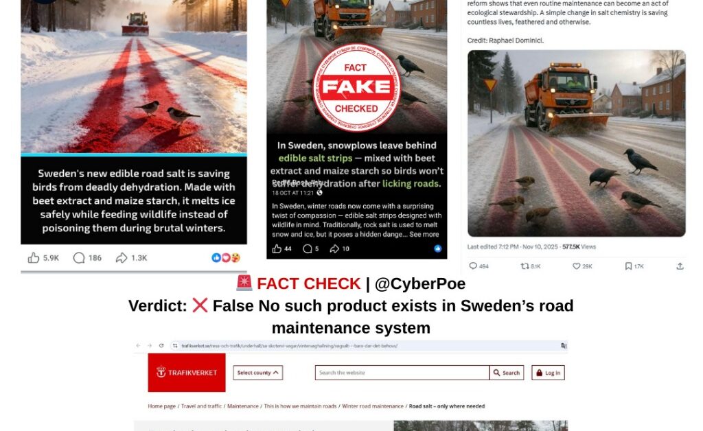 In late 2025, a series of viral posts on X, Facebook, and Instagram claimed that Sweden had replaced traditional winter road salt with a so-called “edible mixture” composed of beet extract and maize starch. According to these posts, the new formulation not only melted ice efficiently during harsh Nordic winters but also allegedly nourished birds, preventing dehydration and mortality that conventional sodium chloride salt might cause. Graphics accompanying the posts depicted birds consuming the salt from roadsides, alongside captions implying that Sweden had innovated a wildlife-friendly de-icing solution. The posts gained considerable traction, receiving tens of thousands of shares and likes, and were treated by some social media users as evidence of Sweden’s environmental progressiveness and ethical approach to winter road maintenance.