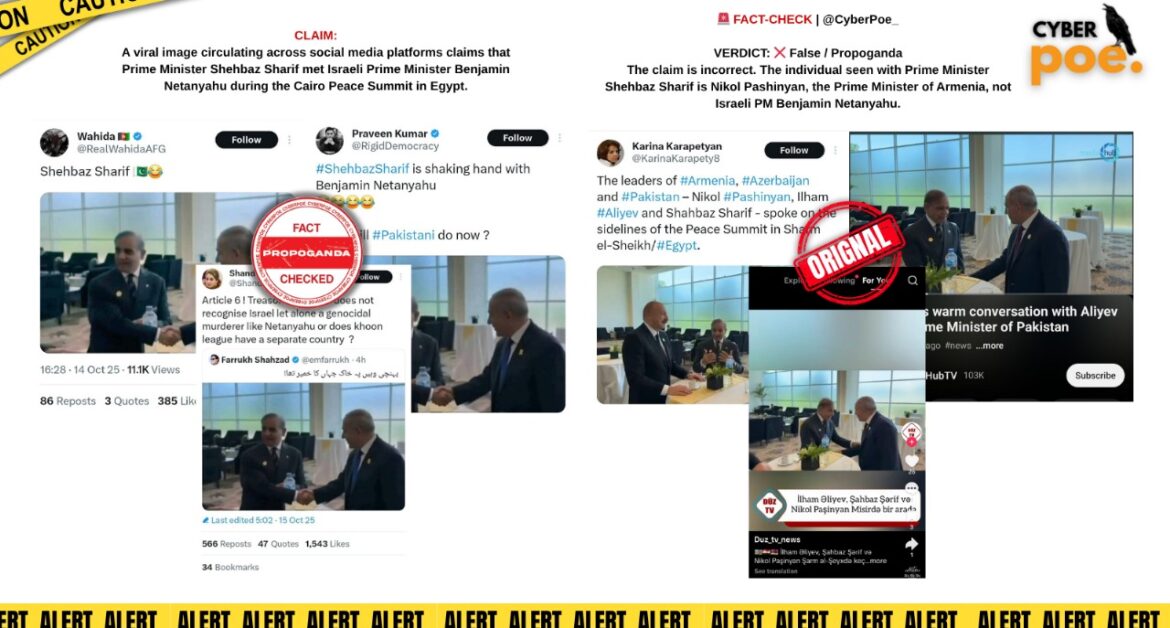 After cross-verifying official sources, event participant lists, and visual details, CyberPoe X concludes that the viral claim is false. Prime Minister Shehbaz Sharif did not meet Israeli Prime Minister Benjamin Netanyahu during the Cairo Peace Summit or at any related event. The man in the image is Nikol Pashinyan, the Prime Minister of Armenia, and the photograph documents a legitimate diplomatic engagement between Pakistan and Armenia.