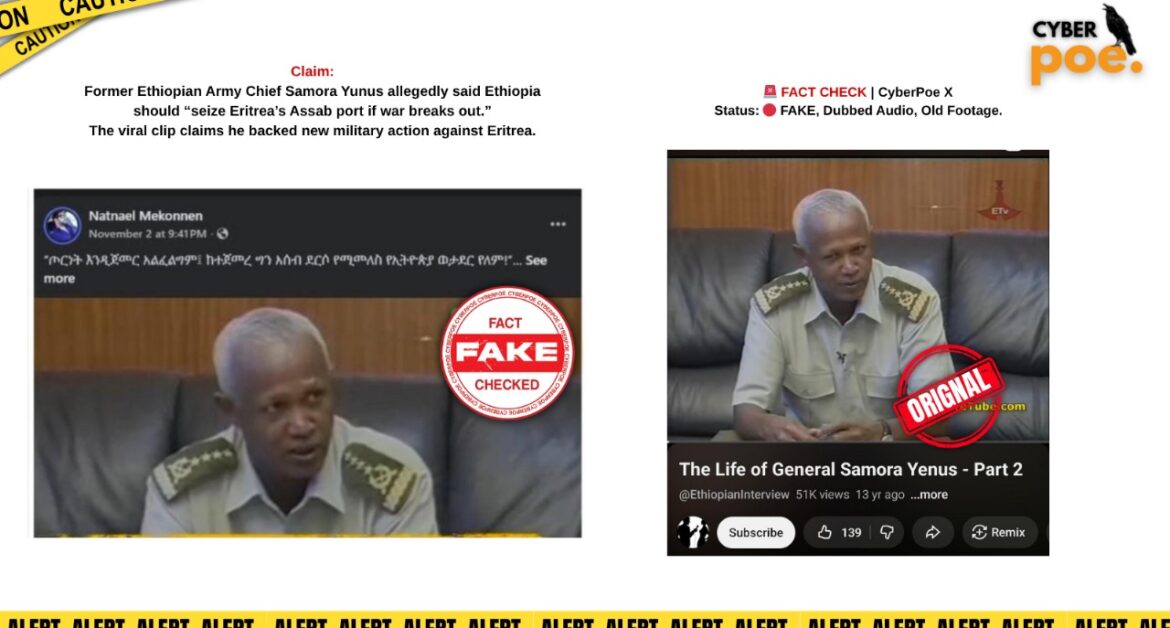 A video circulating on social media claims that former Ethiopian Army Chief, General Samora Yunus, urged Ethiopia to seize Eritrea’s Assab port if war were to break out. The clip presents itself as a recent statement, allegedly confirming Samora’s call for aggressive action against Eritrea. However, detailed investigation by CyberPoe X reveals that the footage is old, manipulated, and entirely misleading a digital fabrication designed to fuel regional tension.