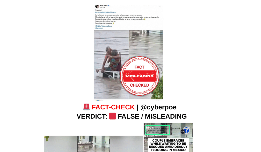 The viral photos of an elderly couple allegedly taken during Typhoon Kalmaegi in Cebu are misattributed. They originate from Mexico’s Poza Rica floods in October 2025 and have no connection to the Philippines or the recent typhoon. The spread of this false claim highlights how emotionally charged imagery is often repurposed to exploit real tragedies and gain social media engagement.