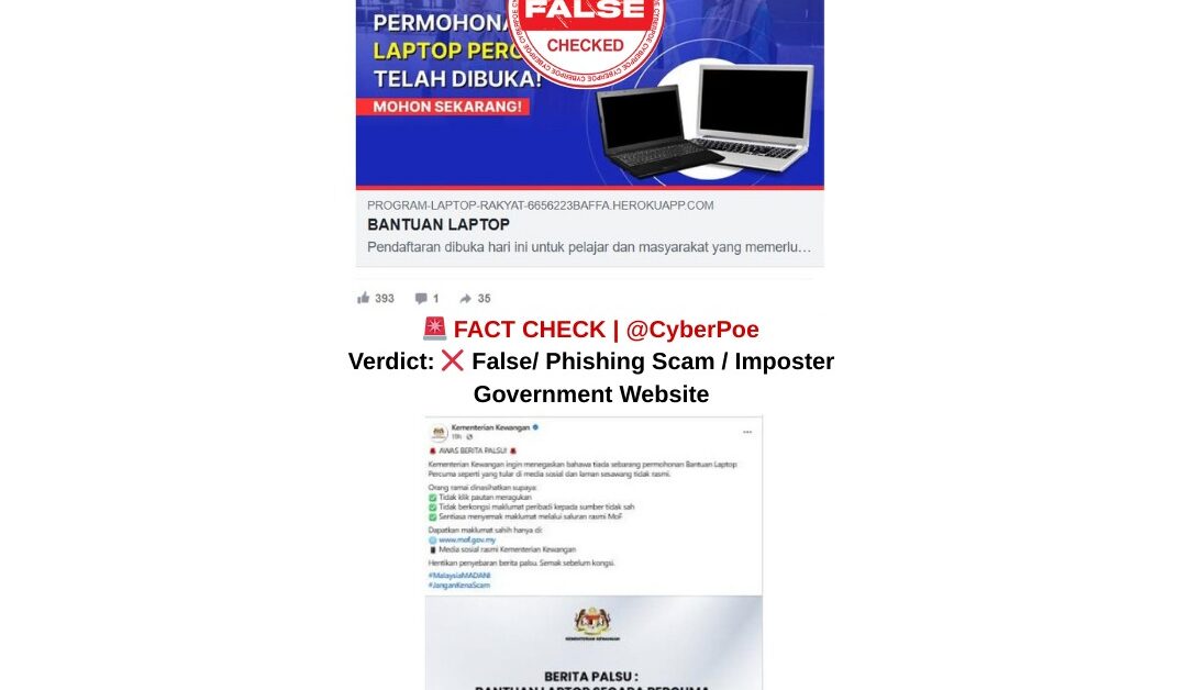 The claim that the Malaysian government has launched a free laptop assistance programme through the circulating websites is false. The Ministry of Finance has publicly denied the existence of such a scheme. The linked websites lack the official “.gov.my” domain suffix and display characteristics consistent with phishing operations.