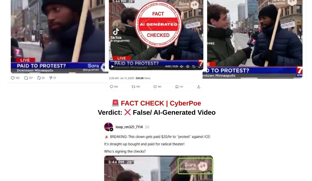 In the volatile aftermath of the January 7, 2026 shooting involving a U.S. Immigration and Customs Enforcement agent in Minneapolis,[1] a new strand of misinformation rapidly took hold online. A short video clip, styled to resemble a televised street interview, began circulating widely across X,[2] Threads,[3] and other platforms.[4] In the clip, a man identified as an anti-ICE protester appears to admit on camera that he is being paid twenty dollars per hour to participate in demonstrations against immigration enforcement. Shared amid heightened emotions and political polarization, the video was framed as supposed proof that public anger over the shooting was manufactured rather than genuine. CyberPoe’s investigation confirms this claim is entirely false. The video is not authentic footage from Minneapolis but a piece of synthetic media generated using artificial intelligence.