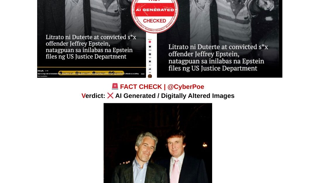 The manipulated images exploit the heightened visibility of the document release, pairing a real historical photograph of Epstein with archival imagery of Duterte to construct a misleading visual narrative.