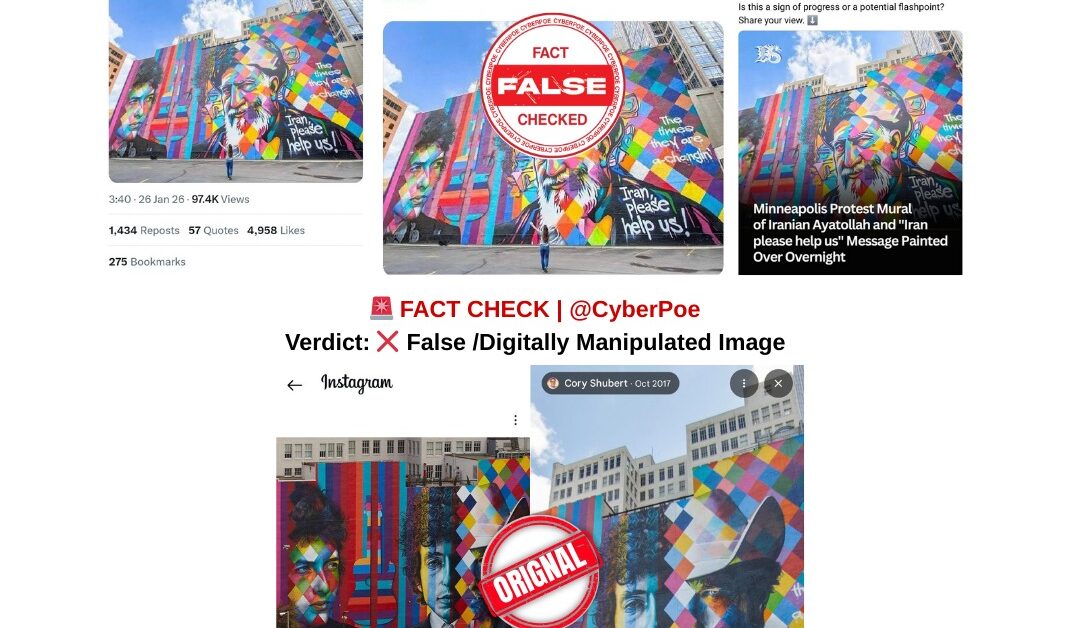 CyberPoe traced the manipulated image to an earlier photograph of the mural published online as far back as 2021. That original image shows the mural exactly as intended, with no references to Iran, no foreign political messaging, and no alterations to Dylan’s likeness. The viral version circulating in January 2026 is a digitally edited composite that replaces Dylan’s face with that of Ayatollah Ali Khamenei and inserts additional text that was never present on the wall. To further verify the claim, journalists physically visited the mural site in Minneapolis on January 29, 2026. Photographs taken on location show the mural unchanged, depicting Bob Dylan in multiple phases of his career, with no evidence of paint-over, vandalism, or political messaging related to Iran.