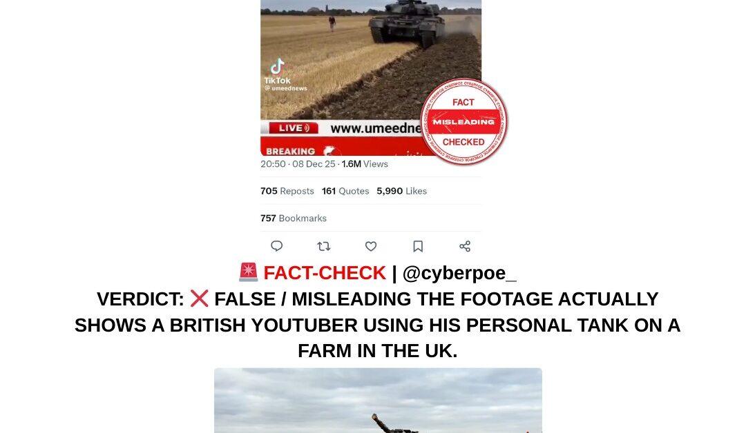 The viral claim that Afghan locals were using an abandoned US tank to plow fields is entirely false. The footage is a civilian stunt filmed in Leicestershire, UK, by British YouTuber Joe Hewes, using his personal Chieftain Mk 11 tank. The video was first uploaded in August 2025 and has been miscaptioned to fit an unrelated narrative about Afghanistan and abandoned US military equipment. CyberPoe rates this claim as ❌ False Miscaptioned Video. The case underscores the importance of verifying video sources, cross-referencing metadata, and consulting original creators before accepting or sharing visually compelling content, especially when it relates to sensitive geopolitical contexts.
