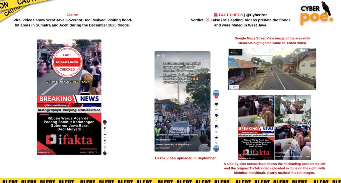 Amid the catastrophic floods and landslides that struck Sumatra and Aceh in December 2025, social media platforms saw a surge in viral content purporting to show West Java Governor Dedi Mulyadi visiting the affected areas. Two widely shared videos circulated on TikTok[1] and Facebook, depicting crowds lining roads and apparently welcoming the Governor as he stepped out of his vehicle. The posts were accompanied by captions suggesting that these visits occurred in Aceh and Padang during the disaster response, positioning Dedi Mulyadi as actively engaged in flood relief. The timing of these posts, coinciding with public grief over the loss of more than 1,100 lives[2], lent emotional weight to the claims.