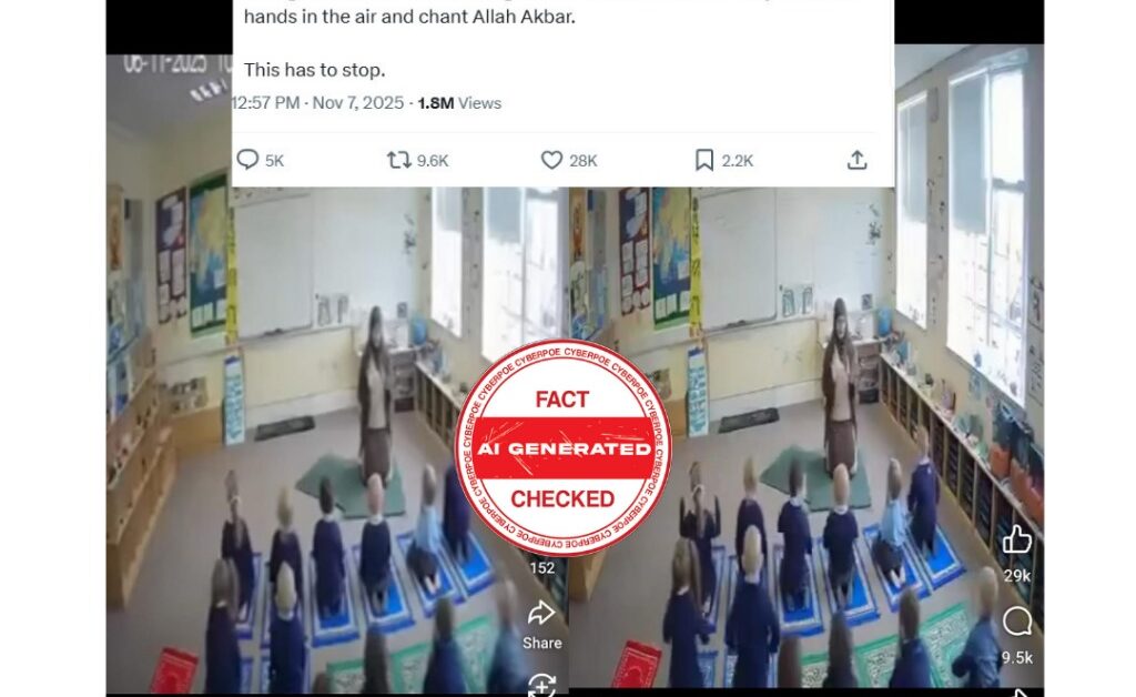 A short 15-second clip is circulating across Western social platforms, presented as CCTV footage from an elementary school classroom. It depicts a hijab-wearing woman appearing to guide white schoolchildren as they kneel on prayer mats and chant “Allahu Akbar” and “Subhan Allah al-A’la.” The posts spreading it frame the scene as proof of “Islamic indoctrination” inside Western schools and claim the video exposes a growing, hidden religious agenda. The narrative gained traction quickly because it leverages ongoing culture-war anxieties and plays directly into pre-existing fears about migrant communities and changing classroom environments.