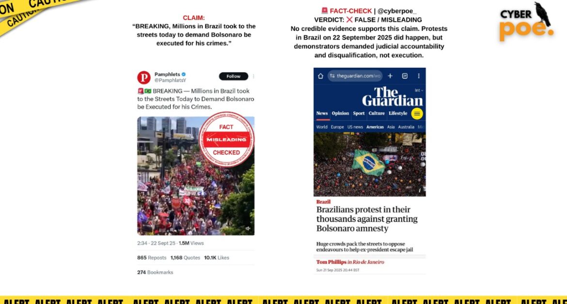 Disinformation thrives during politically charged moments, especially in countries with polarized societies and high-stakes legal battles. Brazil is no exception. In September 2025, a viral claim began circulating across X, Facebook, TikTok, and WhatsApp, alleging that “millions” of Brazilians had taken to the streets to demand former president Jair Bolsonaro’s execution for his crimes. The posts were accompanied by sensationalist headlines, misleading videos of large demonstrations, and hashtags linking the story to ongoing judicial proceedings against Bolsonaro. While the protests were real, the claim about calls for execution was entirely false. Careful verification shows that demonstrators did not demand Bolsonaro’s death but instead sought legal accountability, disqualification from office, and solutions to Brazil’s ongoing economic challenges.