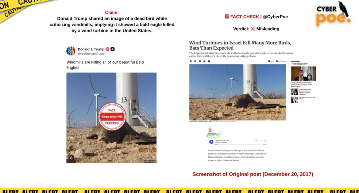 The image shared by Donald Trump does not depict a bald eagle and does not originate from a U.S. wind farm. It is a photograph from a 2017 Israeli news report showing a different raptor species entirely. While bird deaths associated with wind turbines are a real and documented issue, this particular image does not support claims about bald eagles or U.S. renewable energy infrastructure. Accurate sourcing, proper identification, and contextual integrity remain essential for credible public discourse. CyberPoe concludes that the claim is misleading due to misidentification and misuse of an out-of-context image.