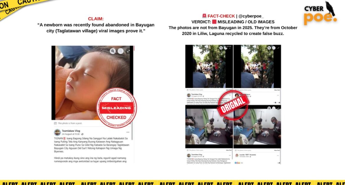 The claim that a newborn was recently discovered abandoned in Bayugan City is false. The images used to support this narrative are recycled from a 2020 incident in Liliw, Laguna, and have been repeatedly reused online in misleading contexts. Local authorities and national child welfare institutions have debunked the claim, highlighting the dangers of spreading unverified content. This case is another example of how emotional imagery can be weaponized to mislead audiences and manipulate online conversations.