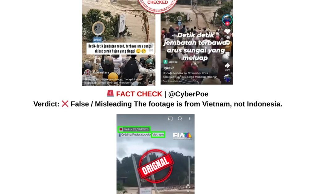 The viral video claiming to show a bridge in Sibolga collapsing during Indonesia’s November 2025 floods is not from Indonesia. It is real footage, but from Vietnam’s Phu Thien Bridge, recorded on November 22 during a separate natural disaster. Misattributing foreign footage during an active domestic crisis is misleading, harmful, and contributes to the broader problem of crisis-era misinformation. CyberPoe continues to urge users to verify sources before sharing dramatic visuals, especially in moments when factual accuracy directly impacts public safety.