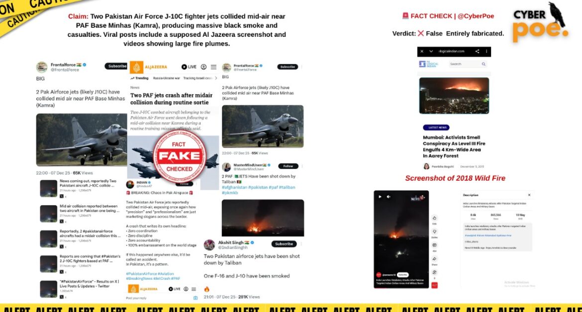 The viral claim of a mid-air collision involving PAF J-10C fighter jets near PAF Base Minhas is entirely fabricated. The accompanying videos and images are misattributed, originating from Indian events in 2018 and 2025, and bear no connection to the Pakistan Air Force. The purported Al Jazeera article cited in posts does not exist, and no official communication from PAF or ISPR supports the narrative. This disinformation fits a larger pattern of anti-Pakistan misinformation campaigns identified by independent agencies, demonstrating the use of visual manipulation and fabricated claims to mislead audiences. Users are strongly advised to verify sources, examine media context, and rely on credible reporting before sharing sensational claims, particularly in matters involving national security and defense operations.