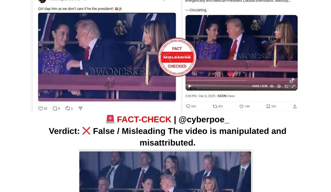 To corroborate these findings, CyberPoe cross-referenced the viral clip with official photographs from the event and additional media coverage. Still images from the same moment confirm that Melania, Donald Trump, and Claudia Sheinbaum were engaged in normal, cordial interaction, without any gestures or expressions that could be interpreted as private disapproval. Visual comparison between the livestream, the still photographs, and the viral clip highlighted clear inconsistencies, confirming the manipulative nature of the circulated footage.